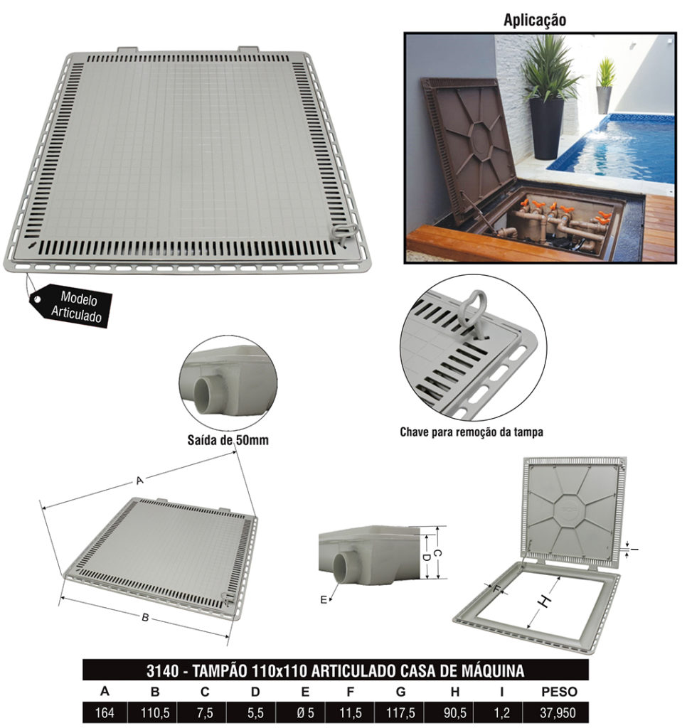 Desenvolvido especialmente para áreas de piscinas, seu diferencial é que a grelha permite a circulação de ar dentro da casa de máquina, diminuindo a umidade e aumentando a vida útil dos equipamentos (bombas, motores e outros). Seu aro possui um sistema próprio de captação de água e um sistema de trava que mantém a tampa aberta.